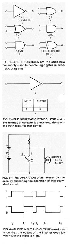 The NOT gate, or inverter, is the simplest form of gate, and, indeed, some do not even consider it a gate. Figure 2-a shows the circuit symbol for that device, while its truth table is shown in Fig. 2b. The equivalent circuit for the inverter is shown in Fig. 3.