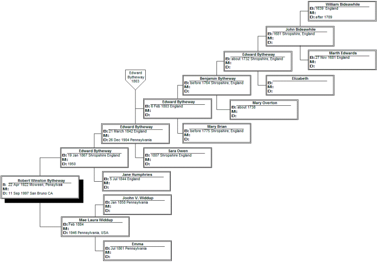I think you will find this information interesting. For years we thought that our heritage originated in Yorkshire, England, but due to the work of Brian Shane Bytheway in Idaho, I think we can now say that our roots were from Shropshire, England. The change in the names Bideawhile and Bidewell to Bytheway started in 1732. Following are details of eight generations of Bytheways. Bill Bytheway